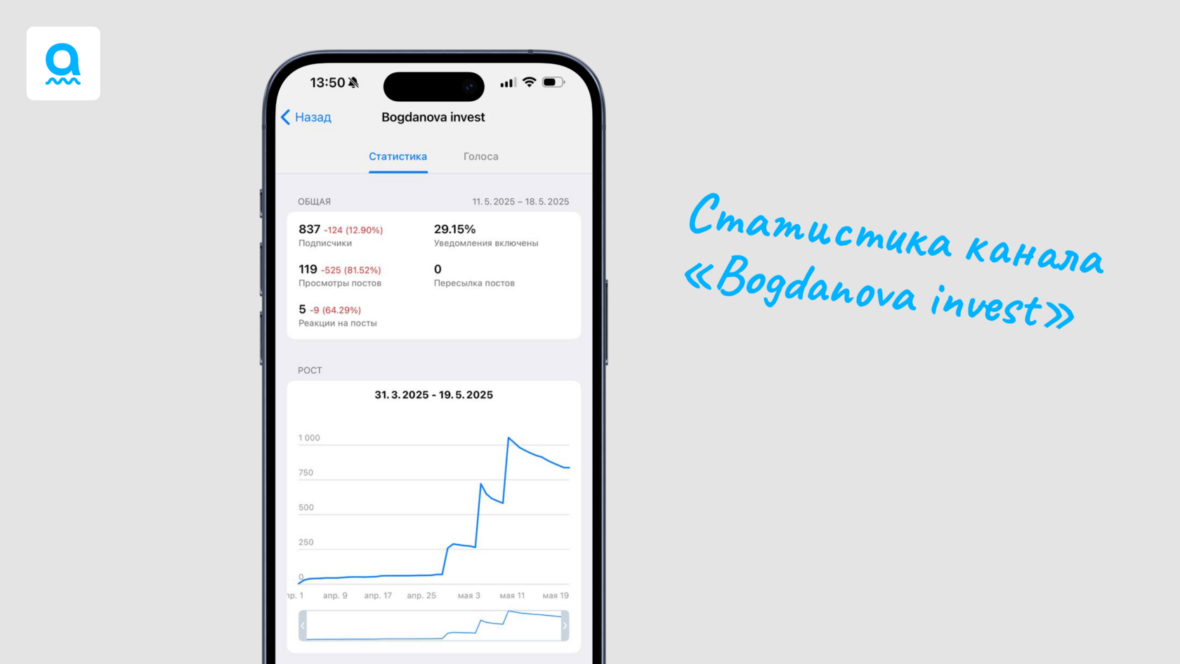Дело было так: я немного разобрался (заняло минут 20) и закинул свой минимальный бюджет — $200. Результат — 1 700 подписчиков. Сейчас в канале около 950 человек. Статистика по просмотрам — 70-100 человек на пост, что примерно 7–10%. Это не максимум, но с этим уже можно работать.