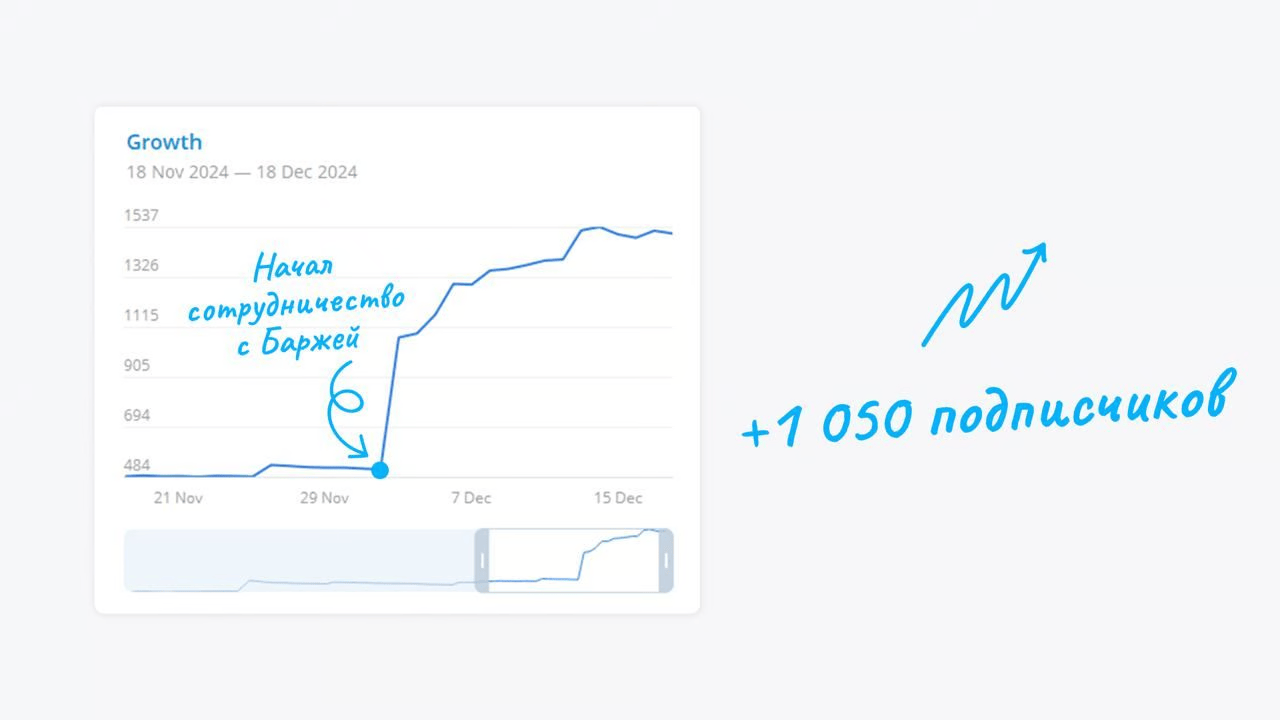 Запустились за 15 минут, получили подписчиков с хорошим вовлечением. Баржа — как сам себе маркетолог: быстро, чётко, результат видно.