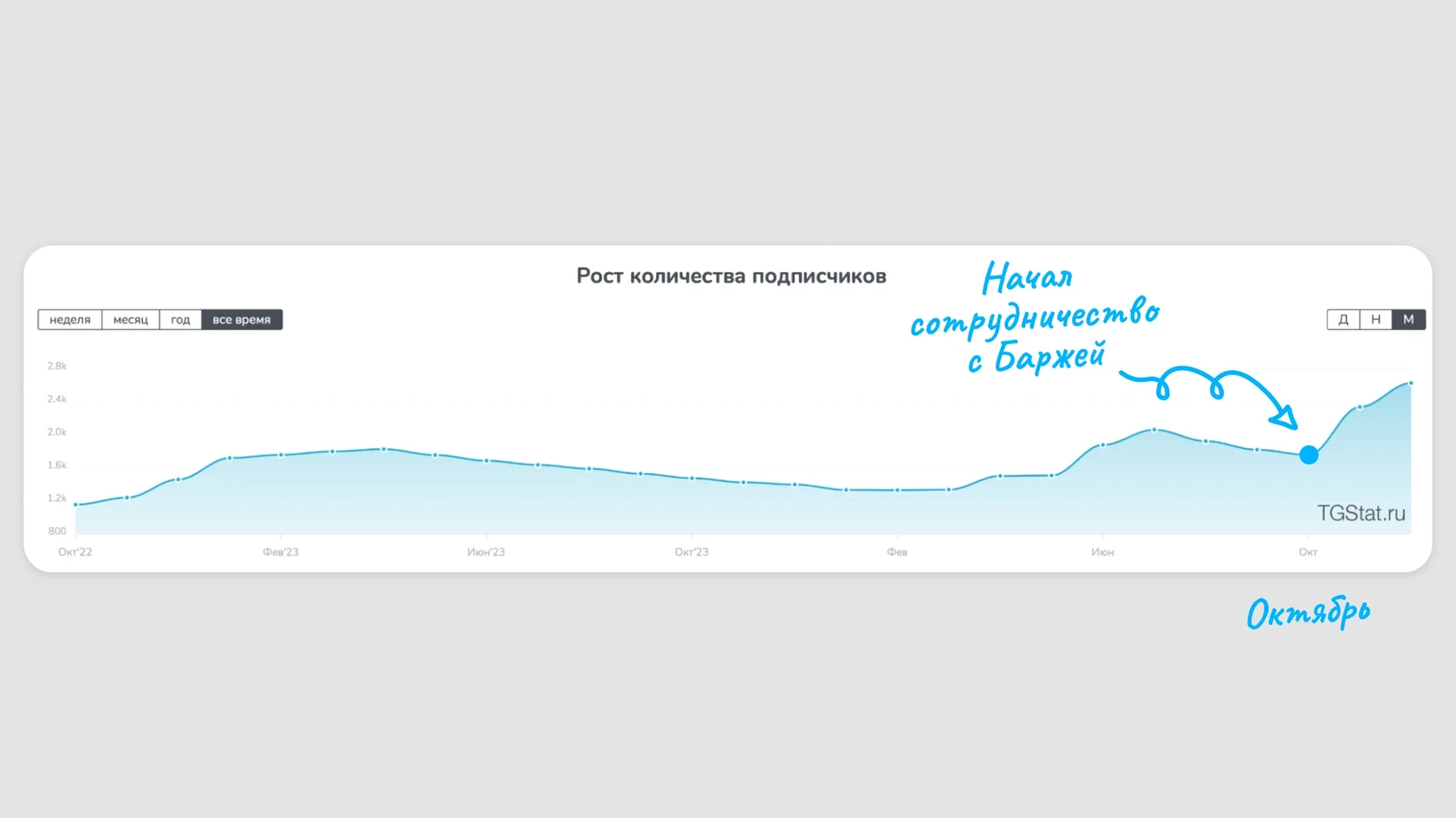На посевах подписчик выходил по 70–150 ₽, а иногда и дороже. С Баржей удалось снизить цену до $0.20 и привлечь 800 человек. Аудитория живая и вовлечённая.