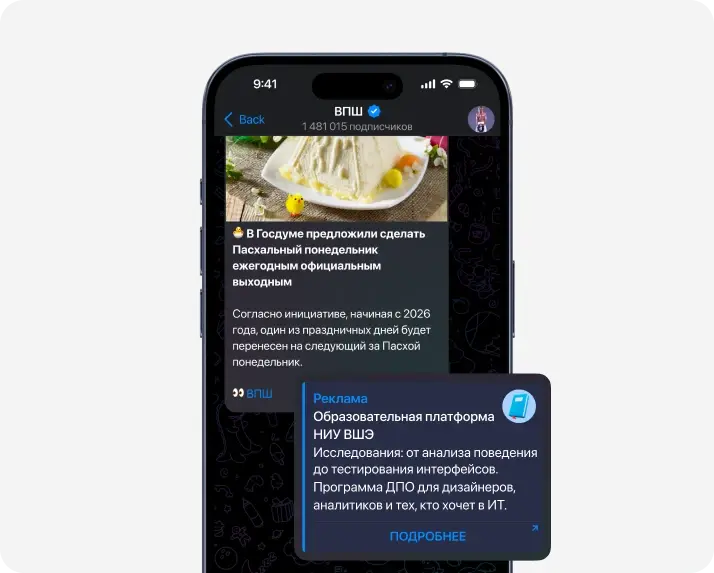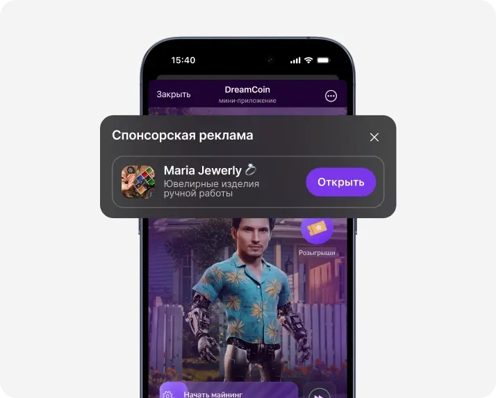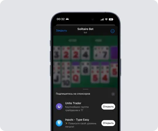 Реклама показывается внутри мини-приложений Telegram — игр, сервисов и полезных инструментов. Пользователи видят оффер в момент вовлечённости, поэтому кликают охотнее. Отличный формат для быстрого охвата активной аудитории.