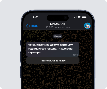 В этом формате пользователь, для получения доступа к материалам — подписывается на ваш канал. Например, чтобы получить доступ к фильму он должен подписаться на ваш канал.