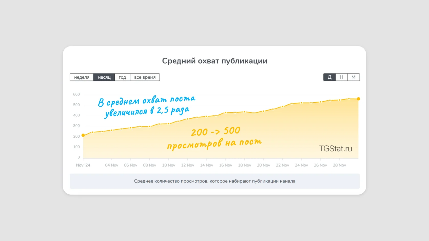 Канал вырос с 600 до 1200 подписчиков всего за несколько месяцев. Подписчики оказались вовлечёнными: читают посты, ставят реакции и активно взаимодействуют с контентом.